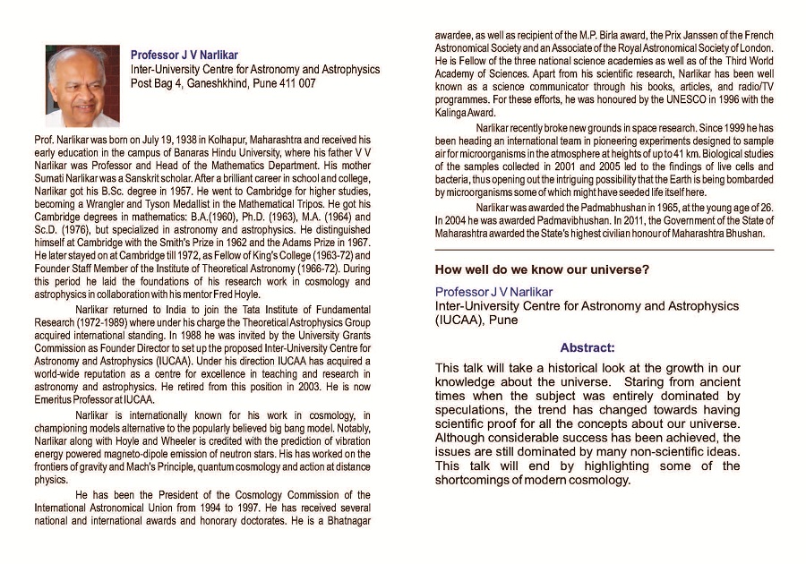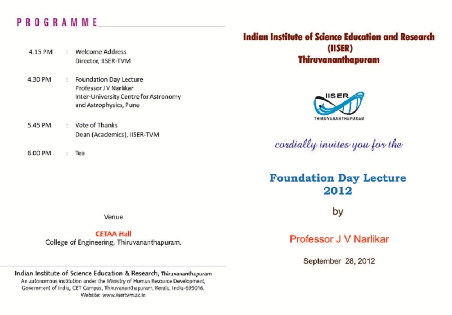 IISER Thiruvananthapuram’s foundation day event for 2012 will be held on 28th September. Professor J V Narlikar, Bhatnagar Fellow and Padmavibhushan will deliver the foundation day lecture at 4:00 PM at the CETAA hall of the College of Engineering Thiruvananthapuram.