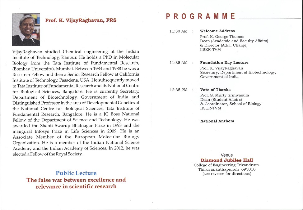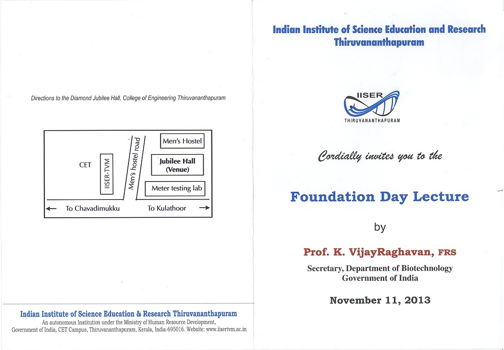 Professor K. VijayRaghavan, Secretary, Department of Biotechnology will deliver the foundation day lecture at 11:35 AM at the Diamond Jubilee Hall hall of the College of Engineering Thiruvananthapuram.