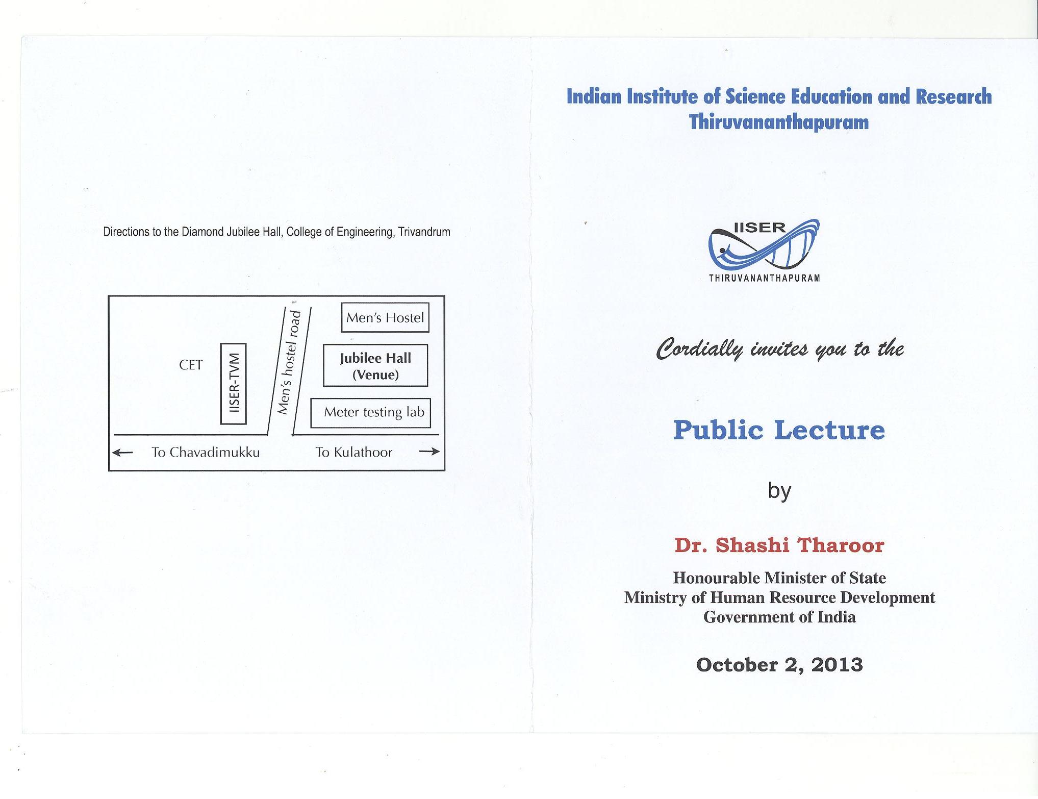 Public Lecture by Dr. Shashi Tharoor on 2nd October 2013