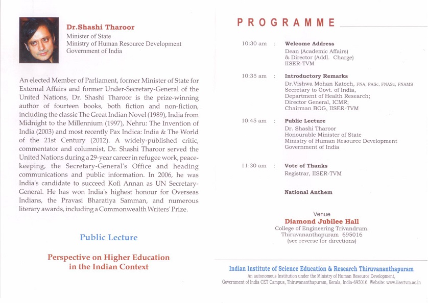 Dr. Sashi Tharoor, Honourable Minister of State, Ministry of Education, Government of India will deliver a public lecture titled Perspective on Higher Education in the Indian Context on October 2nd at 10.30 am in Diamond Jubilee Hall, College of Engineering - Trivandrum.