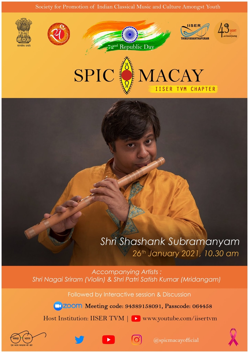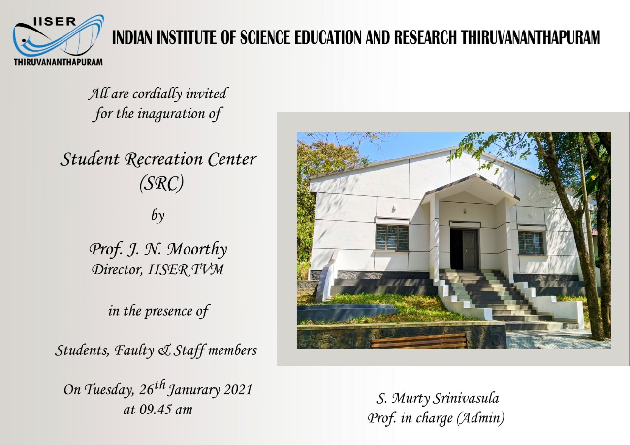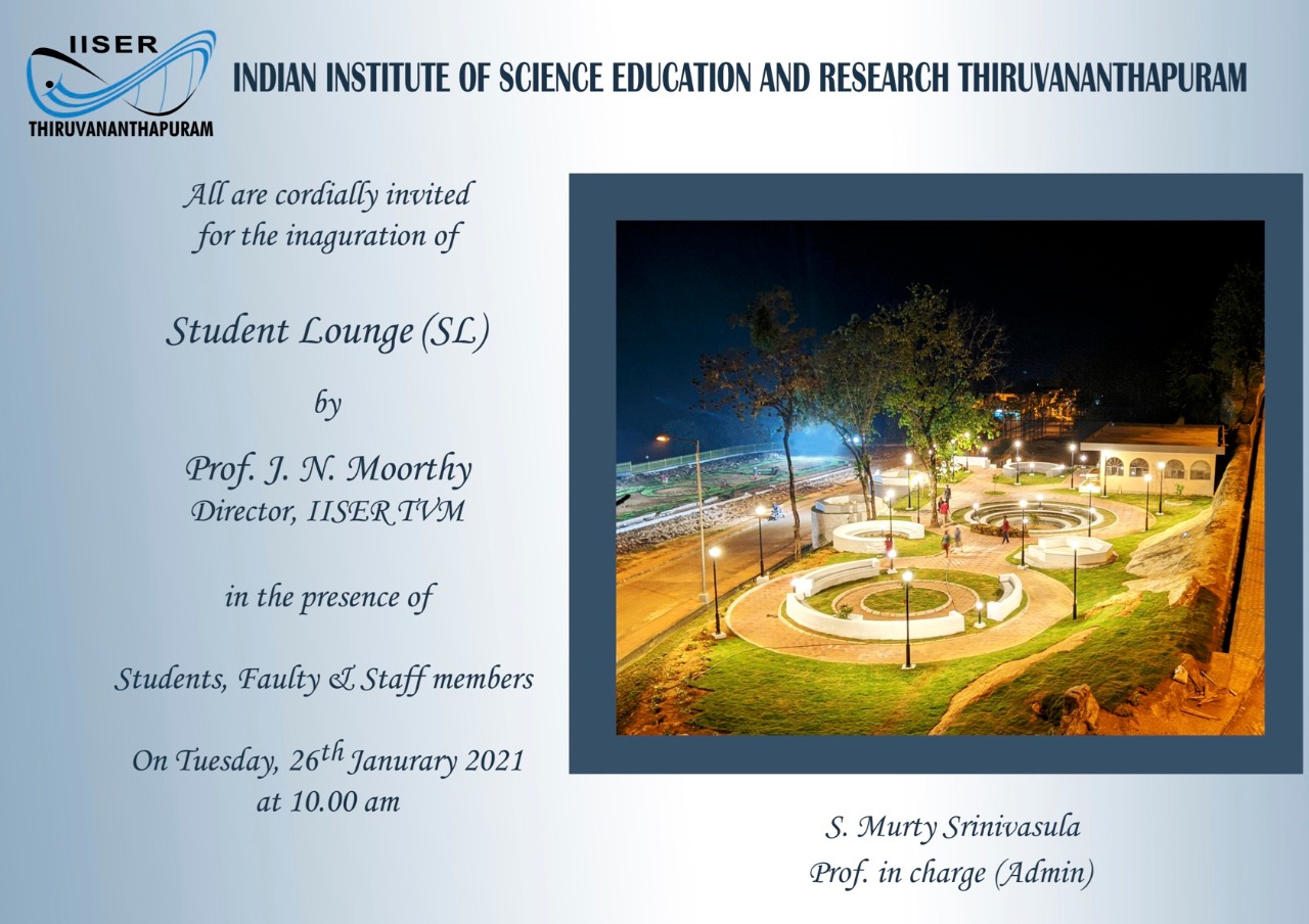 The 72nd Republic Day was celebrated at IISER TVM, and was followed by inauguration of the Student Lounge and the Student Recreation Center by the Director, Prof. J N Moorthy. As part of the celebrations, in collaboration with SPIC MACAY, there was a flute recital by Shri Subramanyam accompanied by Shri Sriram on violin and Shri Satish Kumar on the mridangam