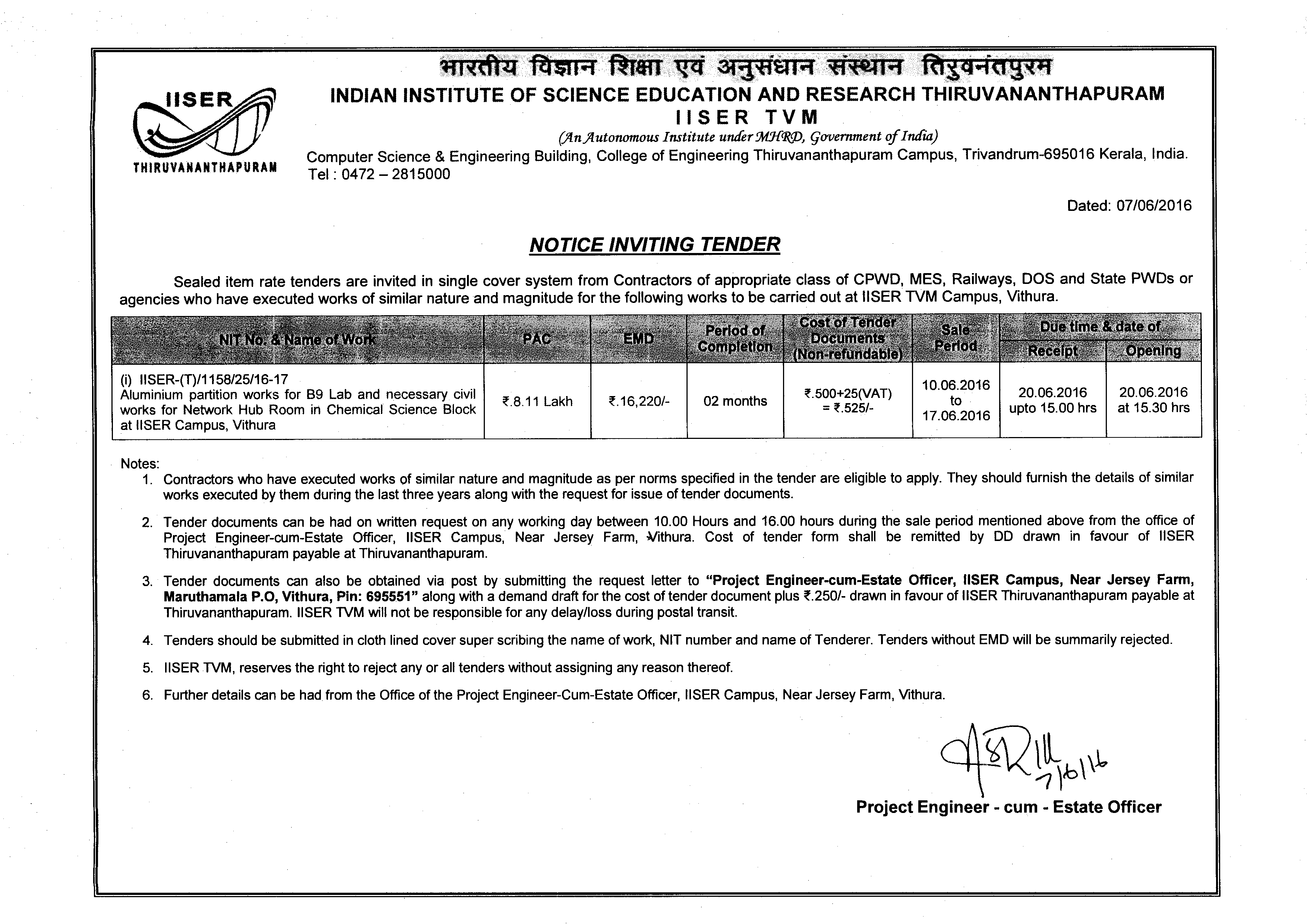 Sealed item rate tenders are invited in single cover system from contractors of appropriate class of CPWD, MES, Railways, DOS and State PWDs or agencies who have executed works of similar nature and magnitude for the following works to be carried out at IISER Campus, Vithura