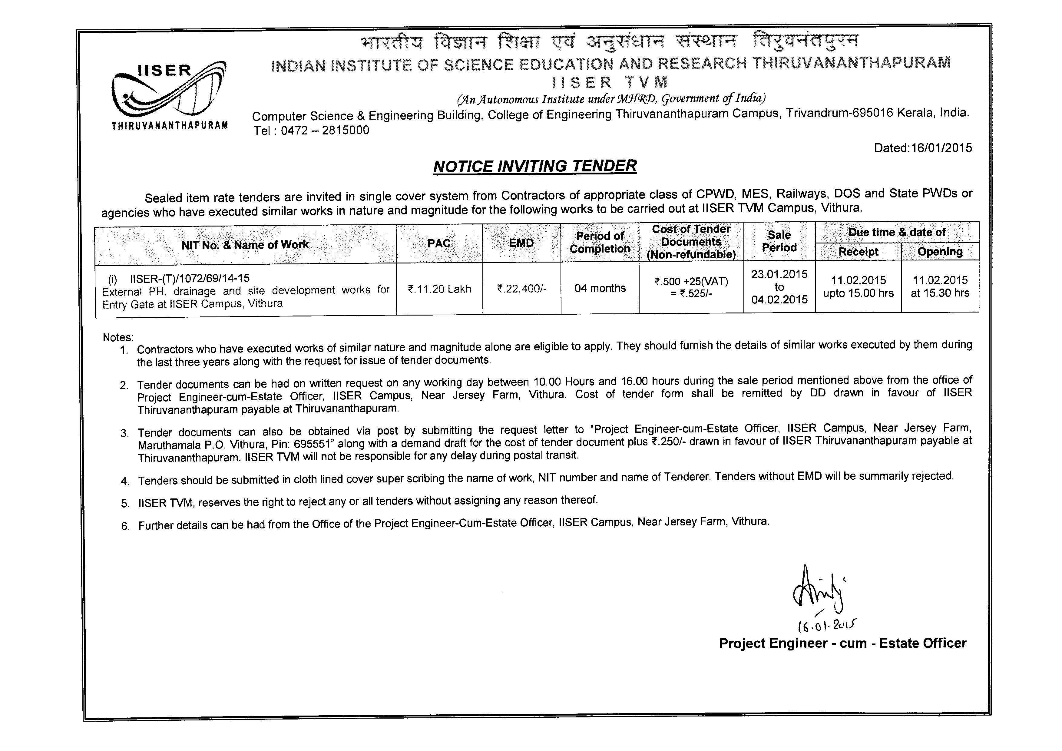 External PH drainage and site development works for Entry Gate at IISER Campus, Vithura