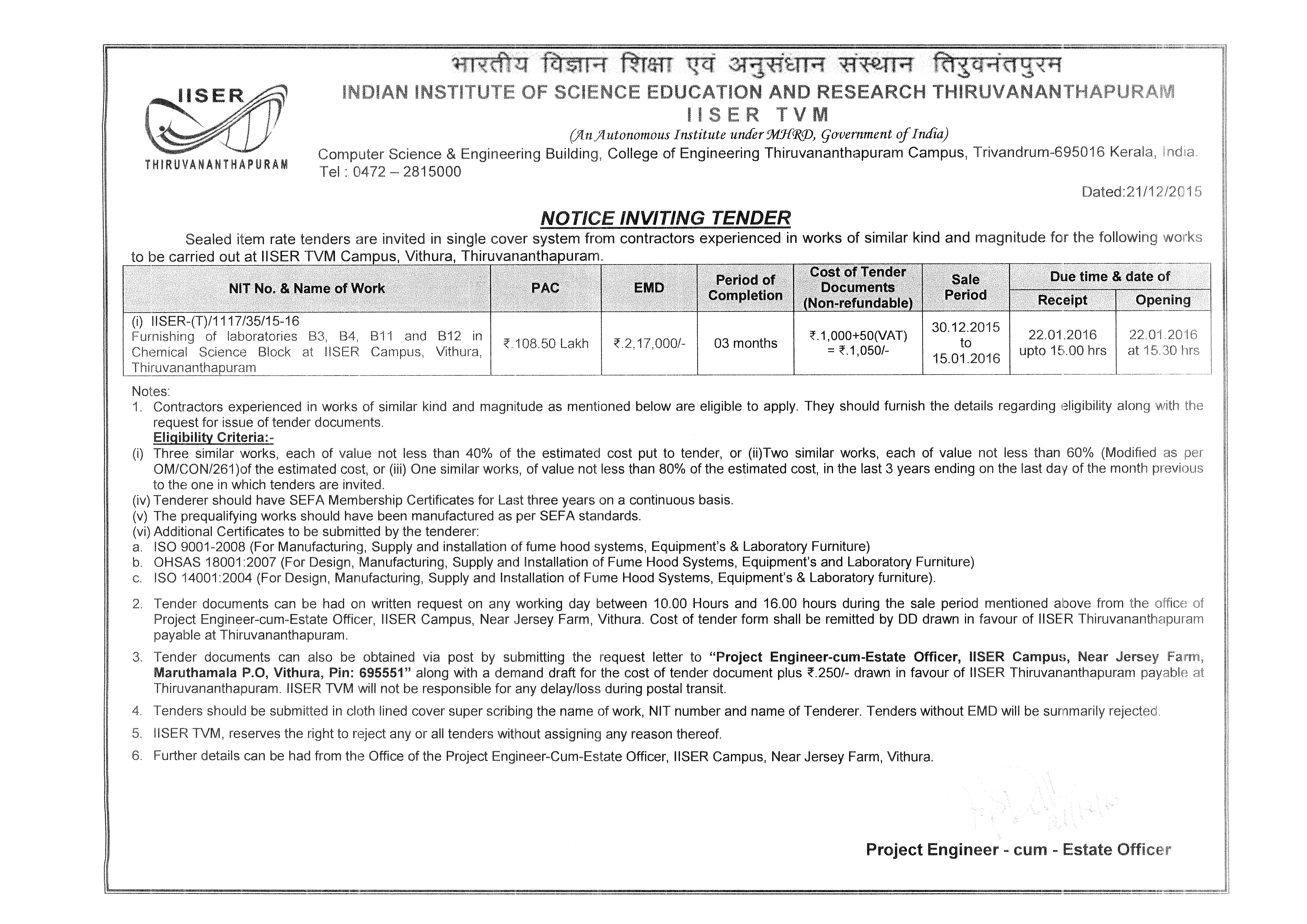 Furnishing of laboratories B3,B4,B11 and B12 in Chemical Science Block