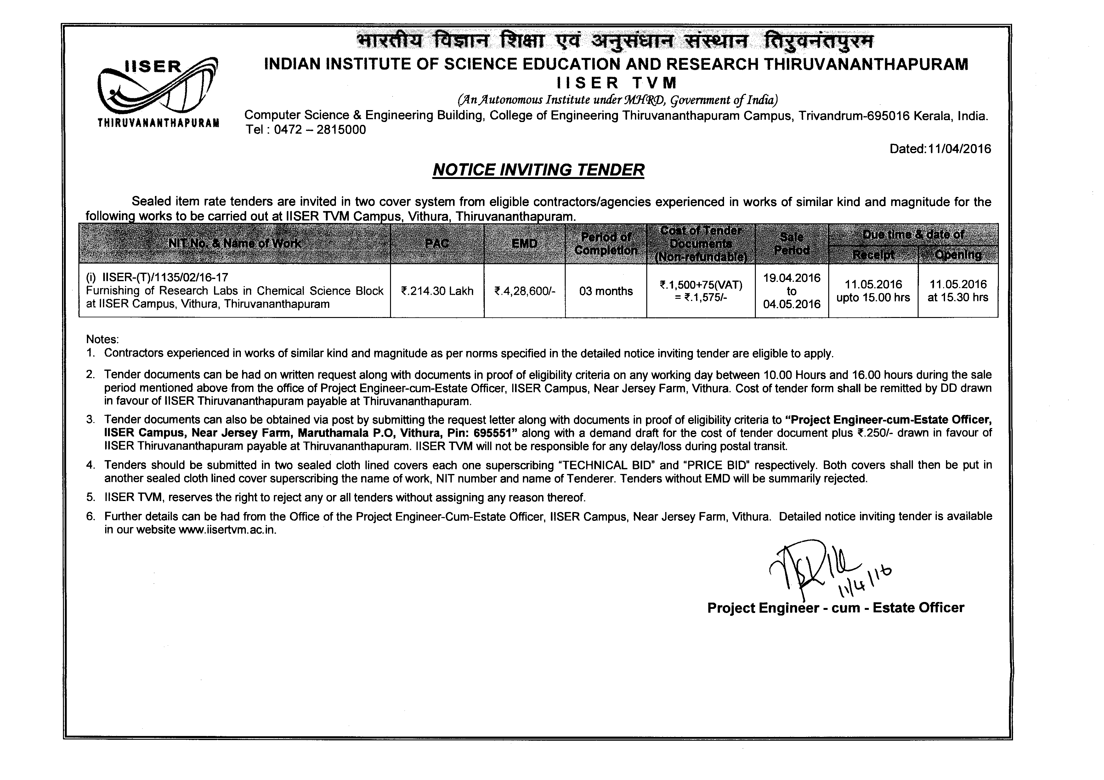 Furnishing of Research Labs in Chemical Science Block at IISER Campus, Vithura, Thiruvananthapuram