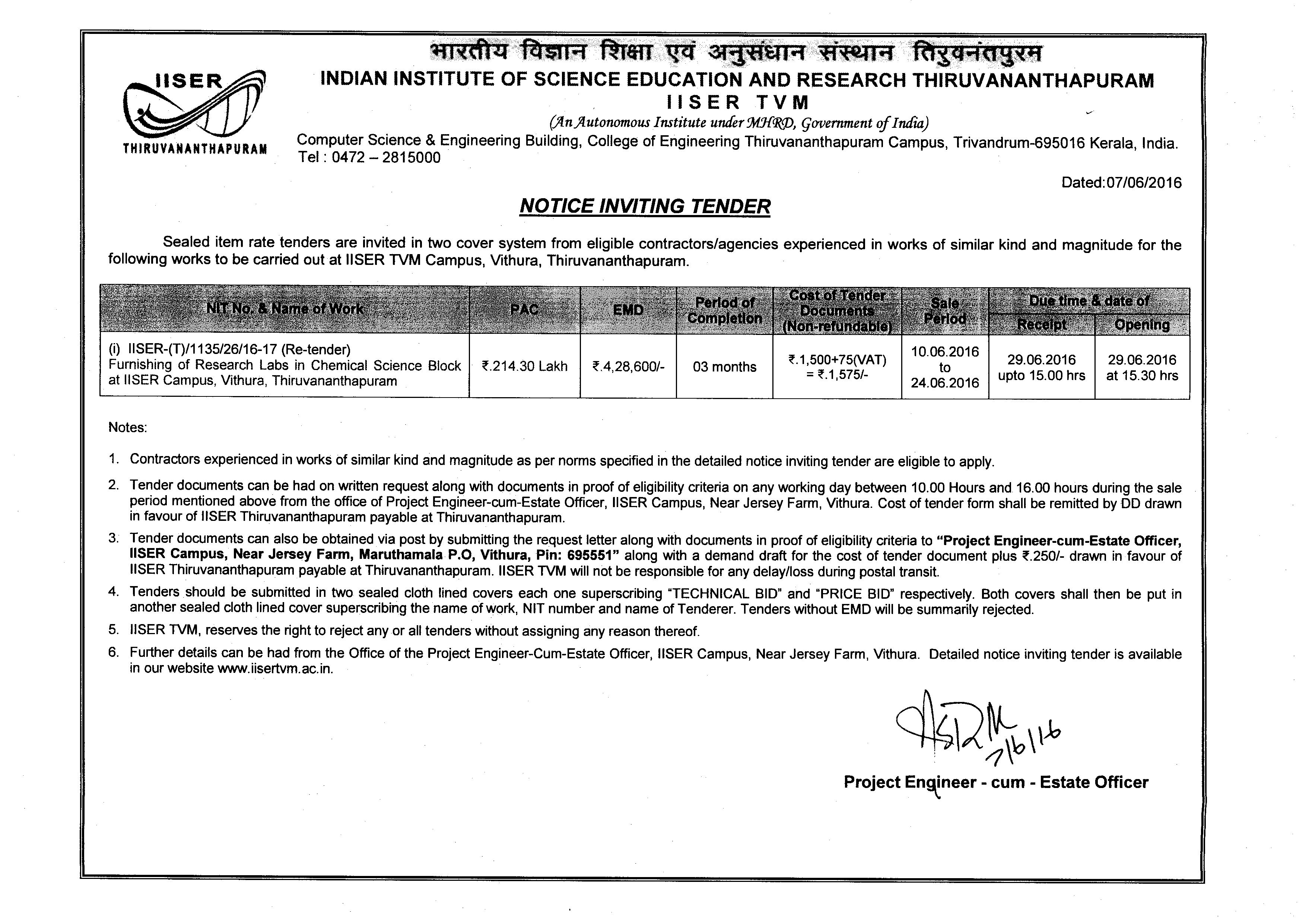 Furnishing of research labs in chemical science block at IISER Campus, Vithura, Thriuvananthapuram