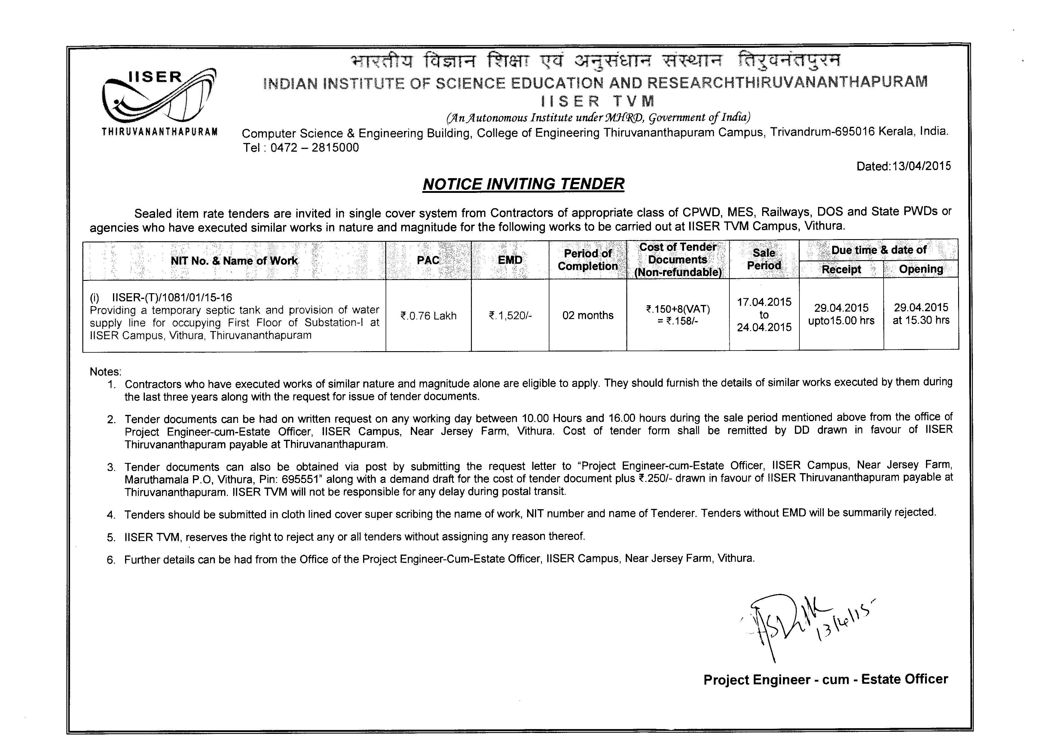 Providing a temporary septic tank and provision of water supply line for occupying First Floor of Substation-I at IISER Campus, Vithura, Thiruvananthapuram