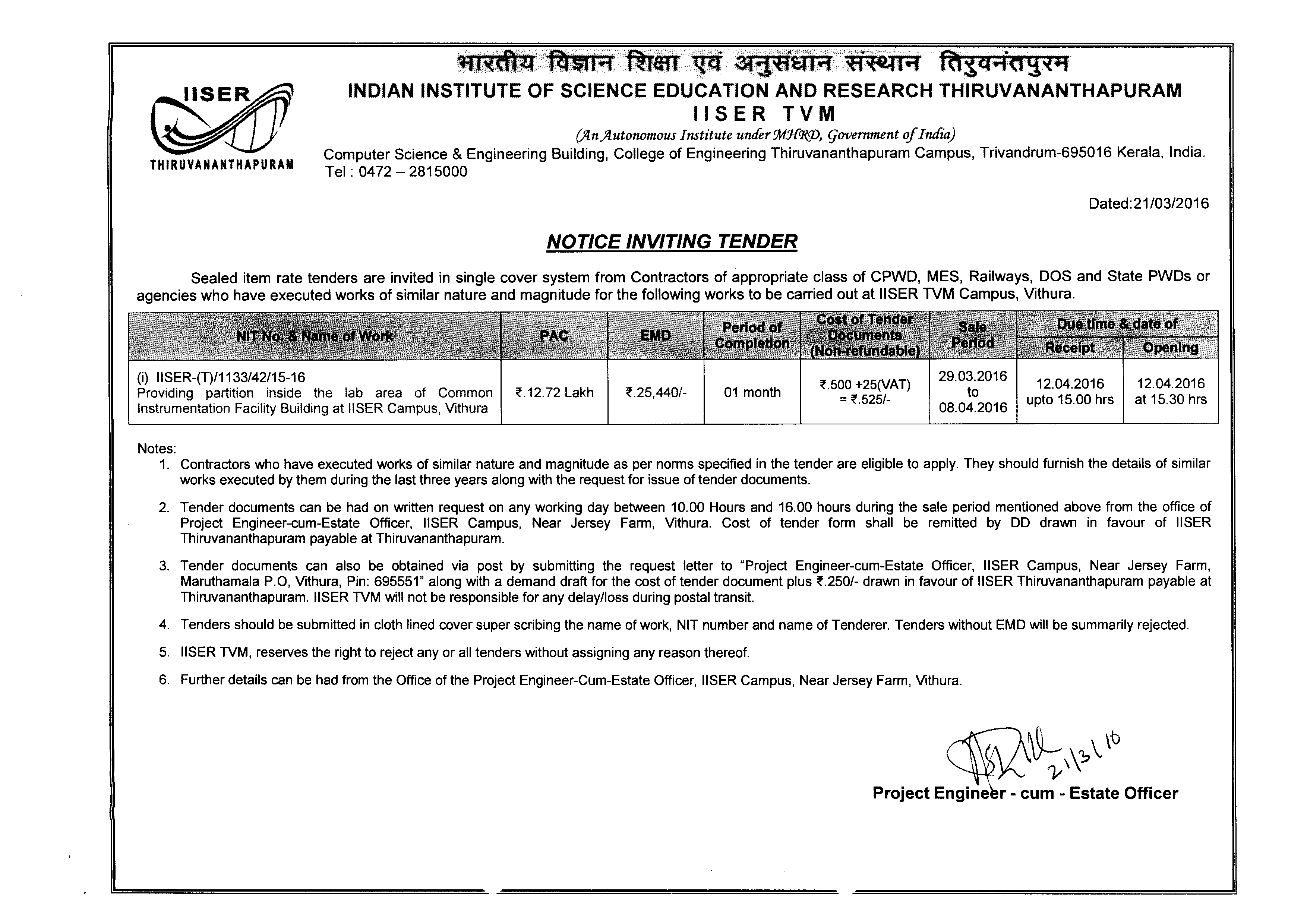Sealed item rate tenders are invited in single cover system from Contractors of appropriate class of CPWD, MES, Railways, DOS and State PWDs or agencies for the following works to be carried out at IISER TVM Campus, Vithura.