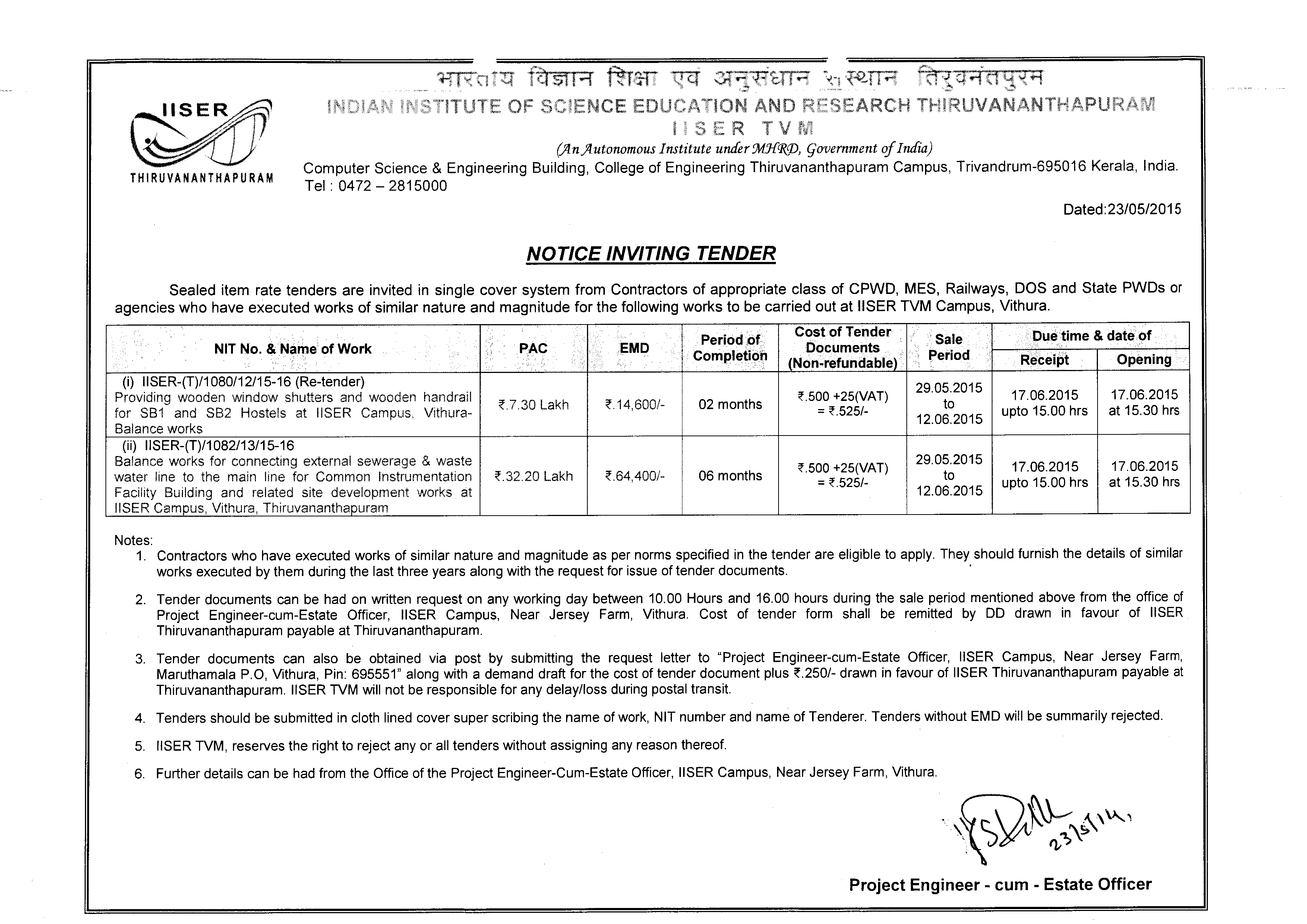 Tender No(i) IISER-(T)/1080/12/15-16 (ii) IISER-(T)/1082/16/15-16