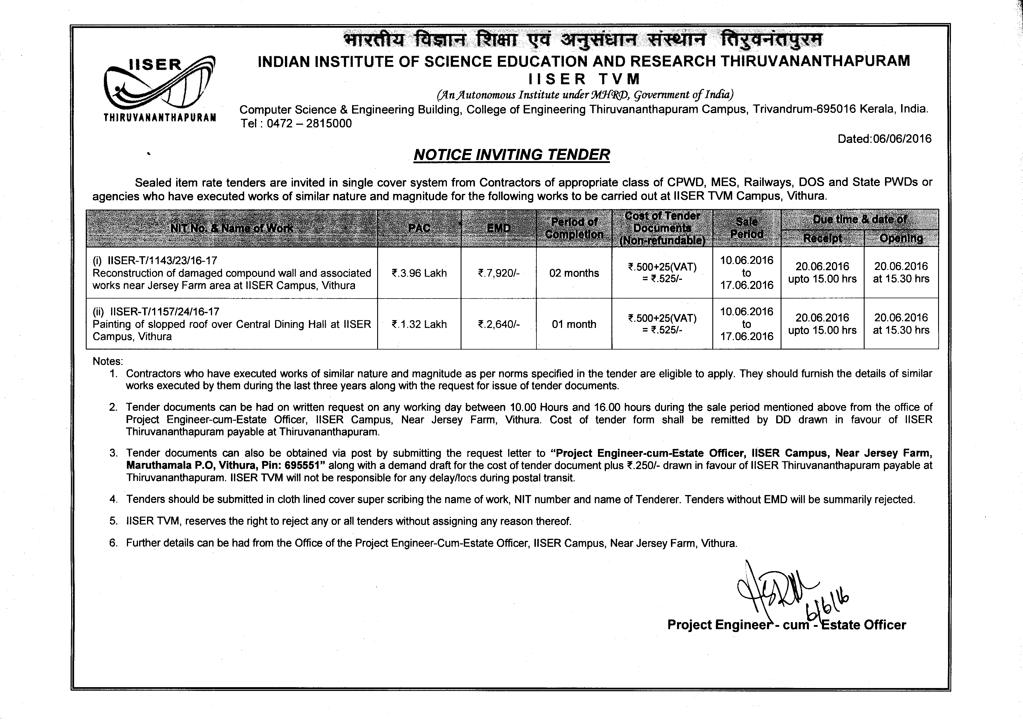 Sealed item rate tenders are invited in single cover system from contractors of appropriate class of CPWD, MES, Railways, DOS and State PWDs or agencies who have executed works of similar nature and magnitude for the following works to be carried out at IISER Campus, Vithura