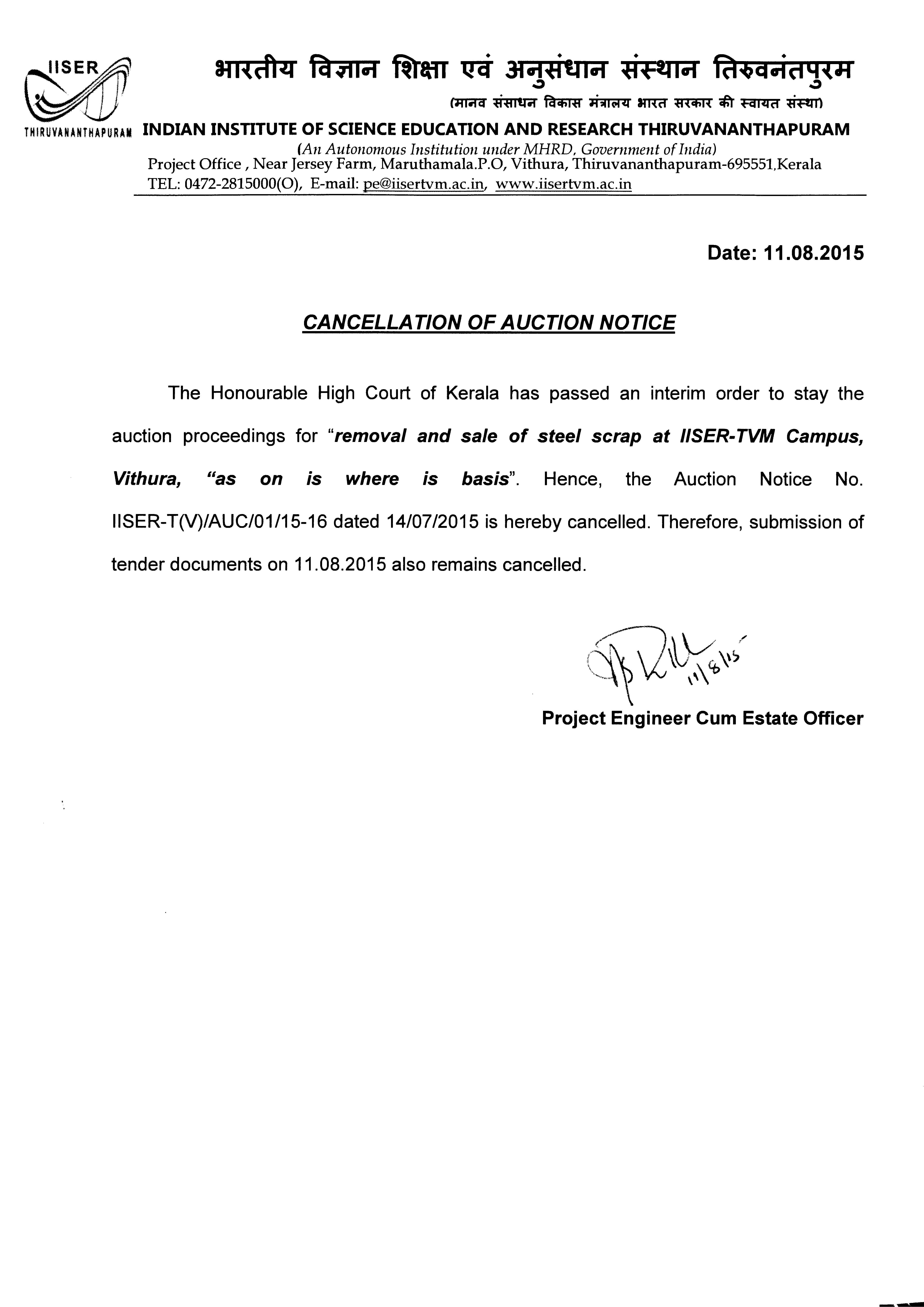 Sealed quotations are invited by Project Engineer cum Estate Officer, IISER TVM for removal and sale of steel scrap at IISER TVM Campus, Vithura, "as on is where is basis", subject to the conditions herewith set forth.