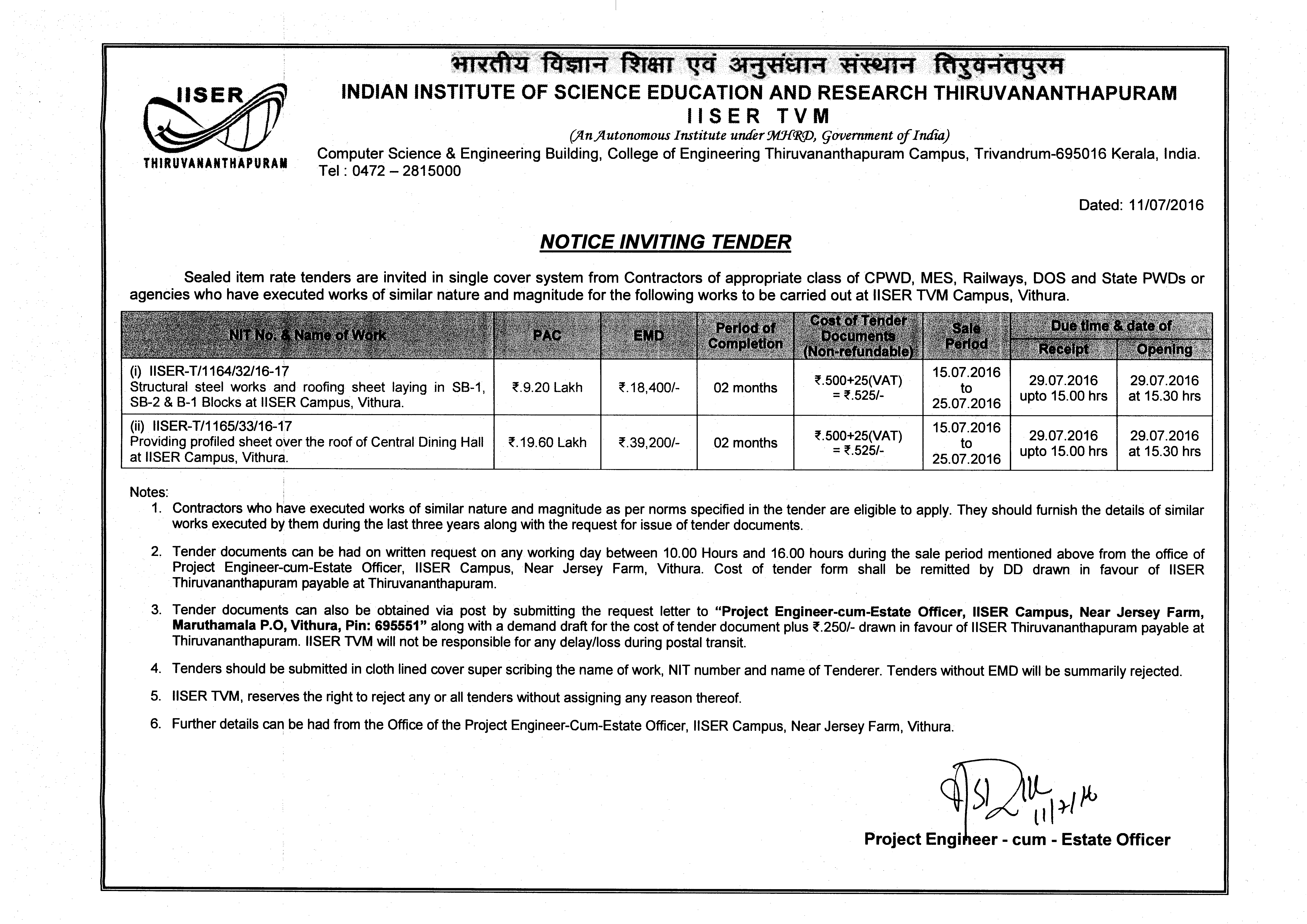 Sealed item rate tenders are invited in single cover system from Contractors of appropriate class of CPWD, MES, Railways, DOS and State PWDs or agencies who have executed works of similar nature and magnitude for the following works to be carried out at IISER TVM Campus Vithura